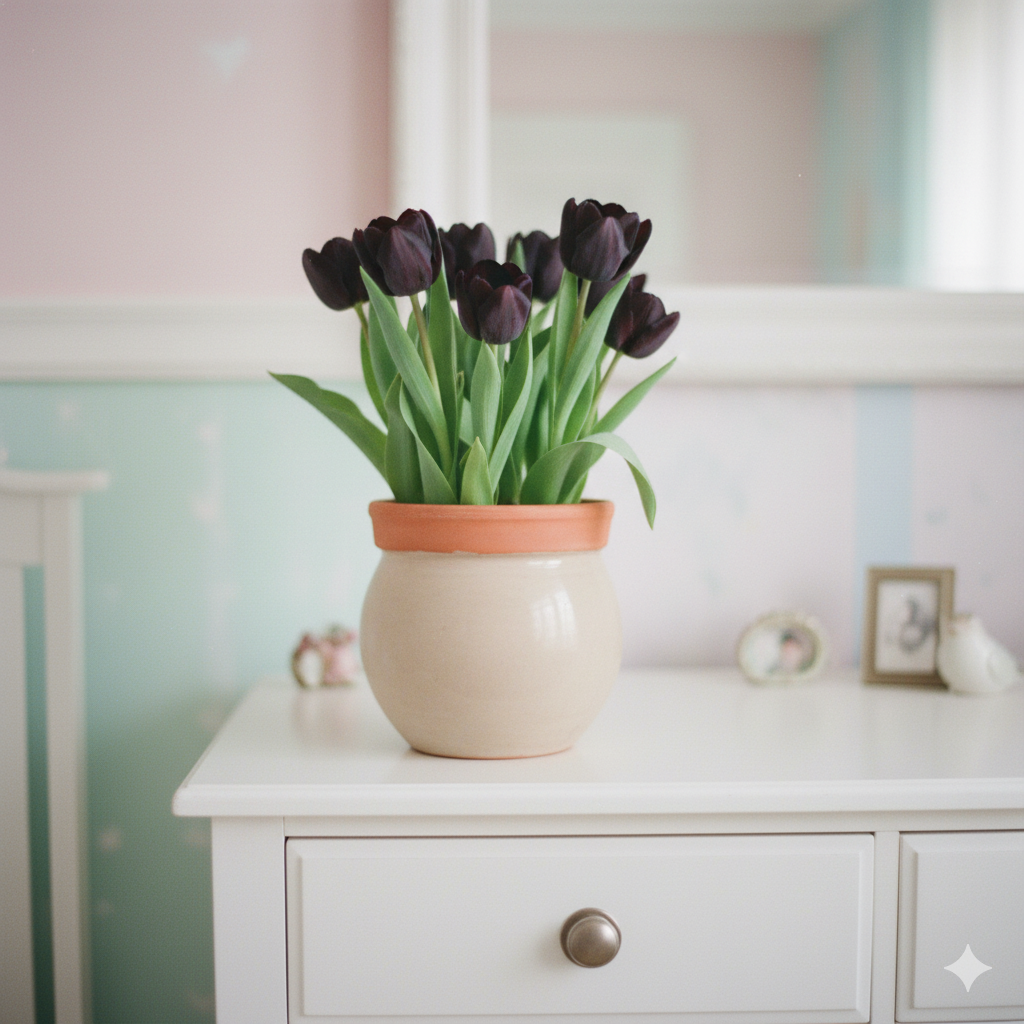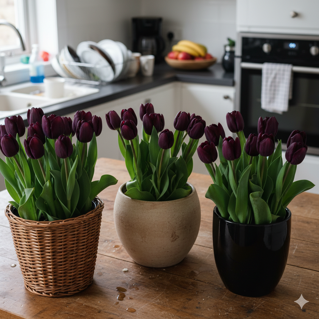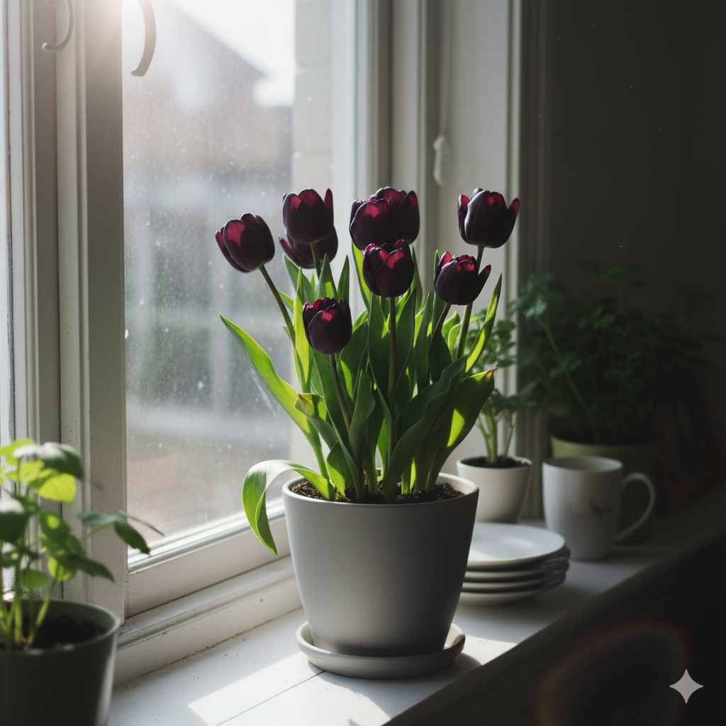 Ці тюльпани можуть цвісти кількома хвилями, наповнюючи інтер’єр глибиною кольору та шляхетною естетикою.