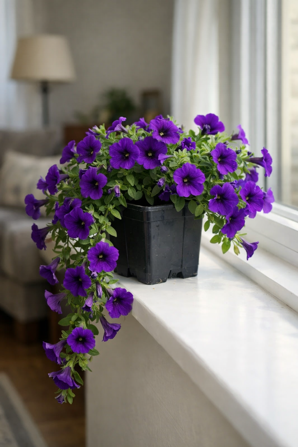 Каскадна петунія на підвіконні: охайний ріст і перші хвилі цвітіння.