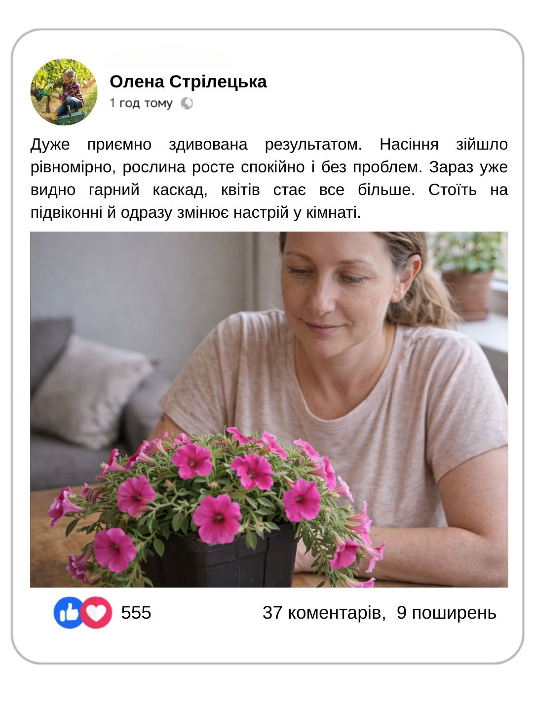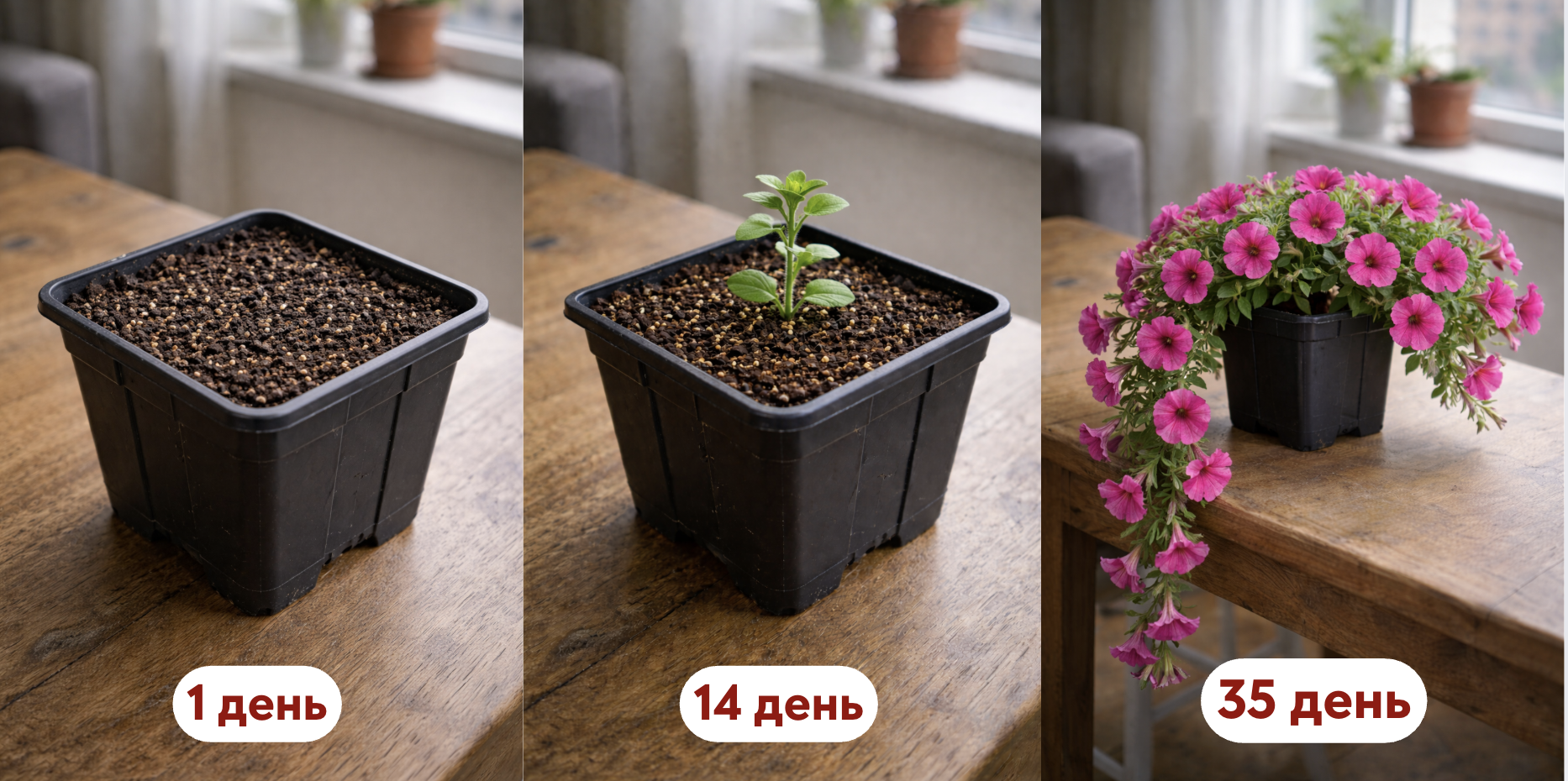 Ви бачите, як петунія росте з перших днів — і точно знаєте, що і в яких умовах її виростили.